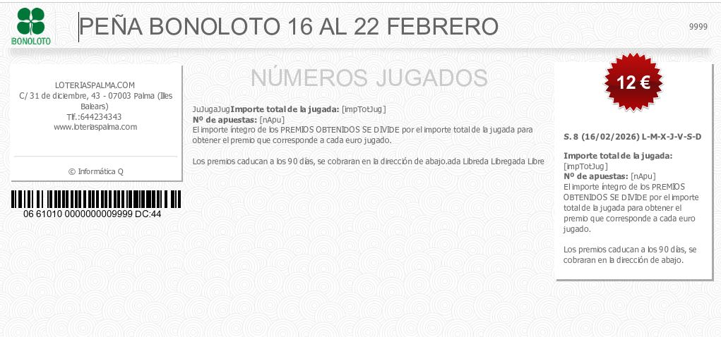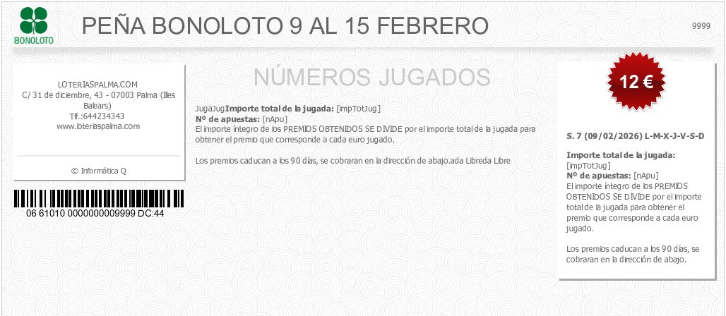 PEÑA BONOLOTO 9 AL 15 FEBRERO