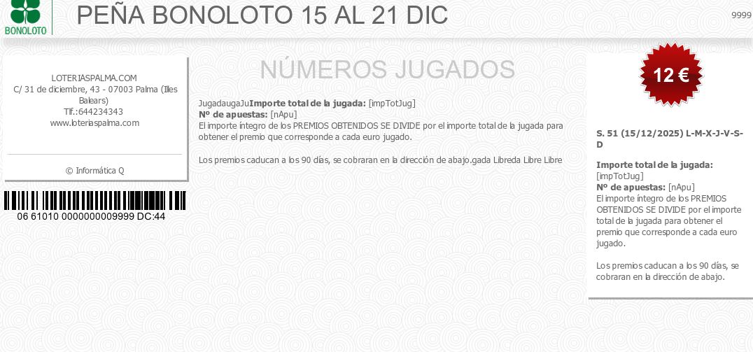 PEÑA BONOLOTO 15 AL 21 DIC